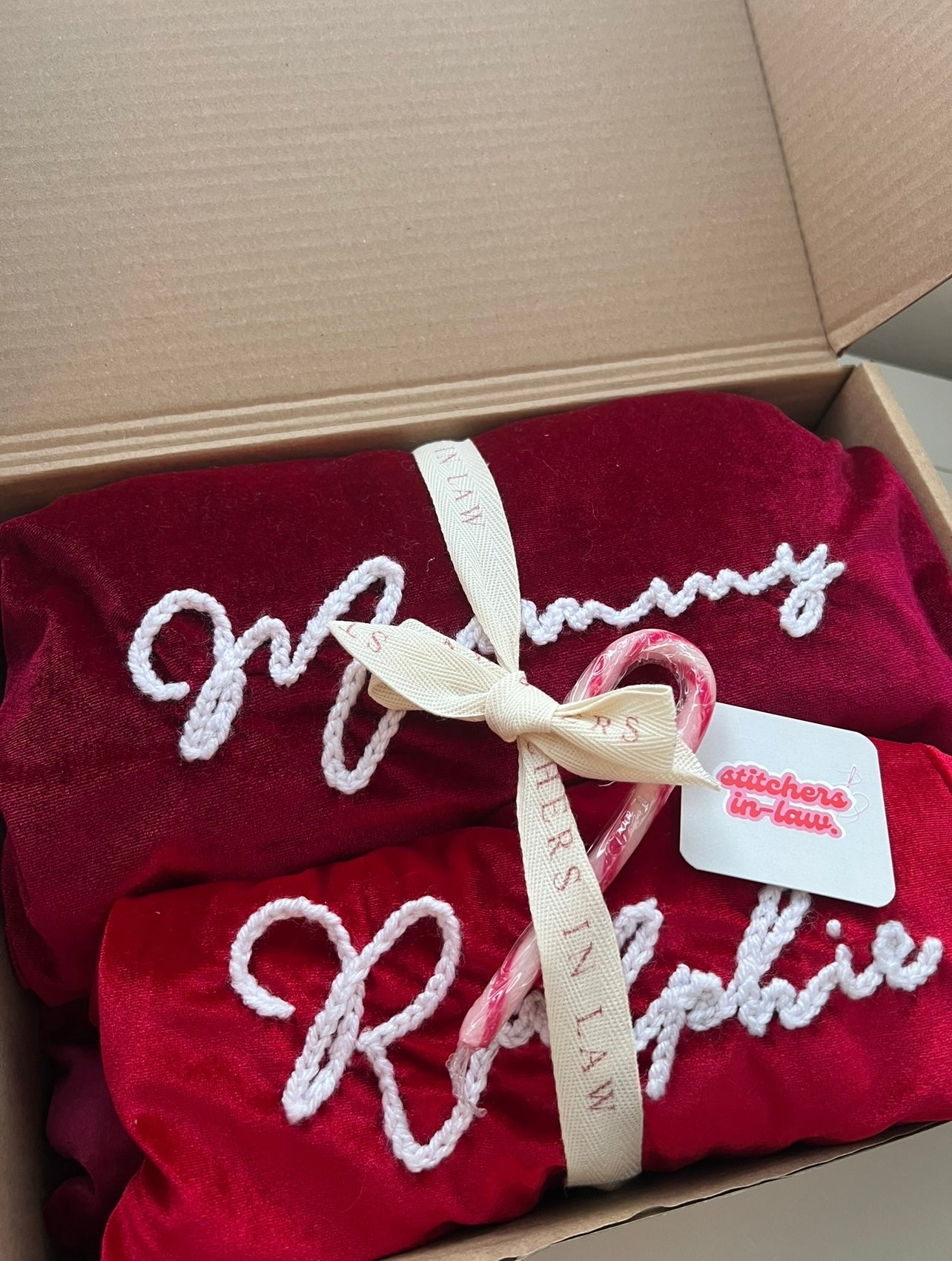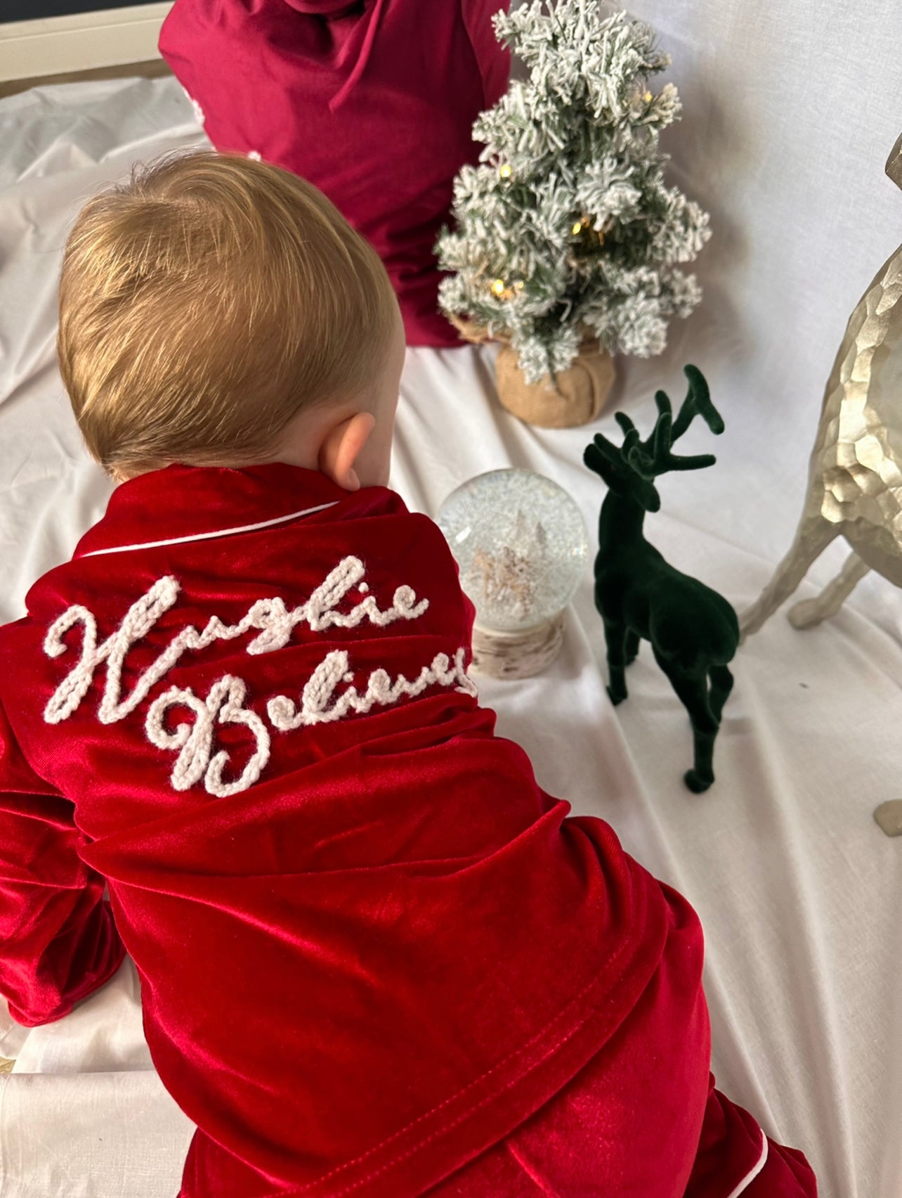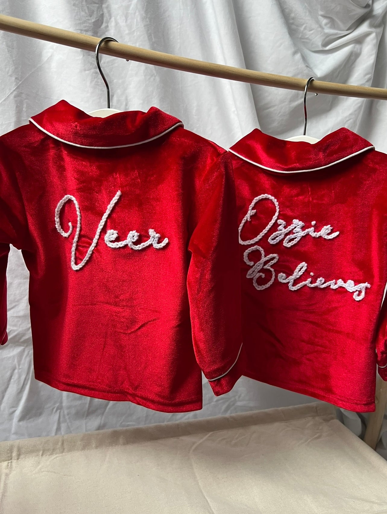 Each set features an elegant embroidered name (One Word) or add on additional letters below as you desire - making it extra special for magical Christmas Eve traditions. The vintage-inspired trim adds a charming touch, while the snug, breathable fit ensures comfort all night long – perfect for watching holiday movies, unwrapping gifts, or waiting for Santa by the tree.