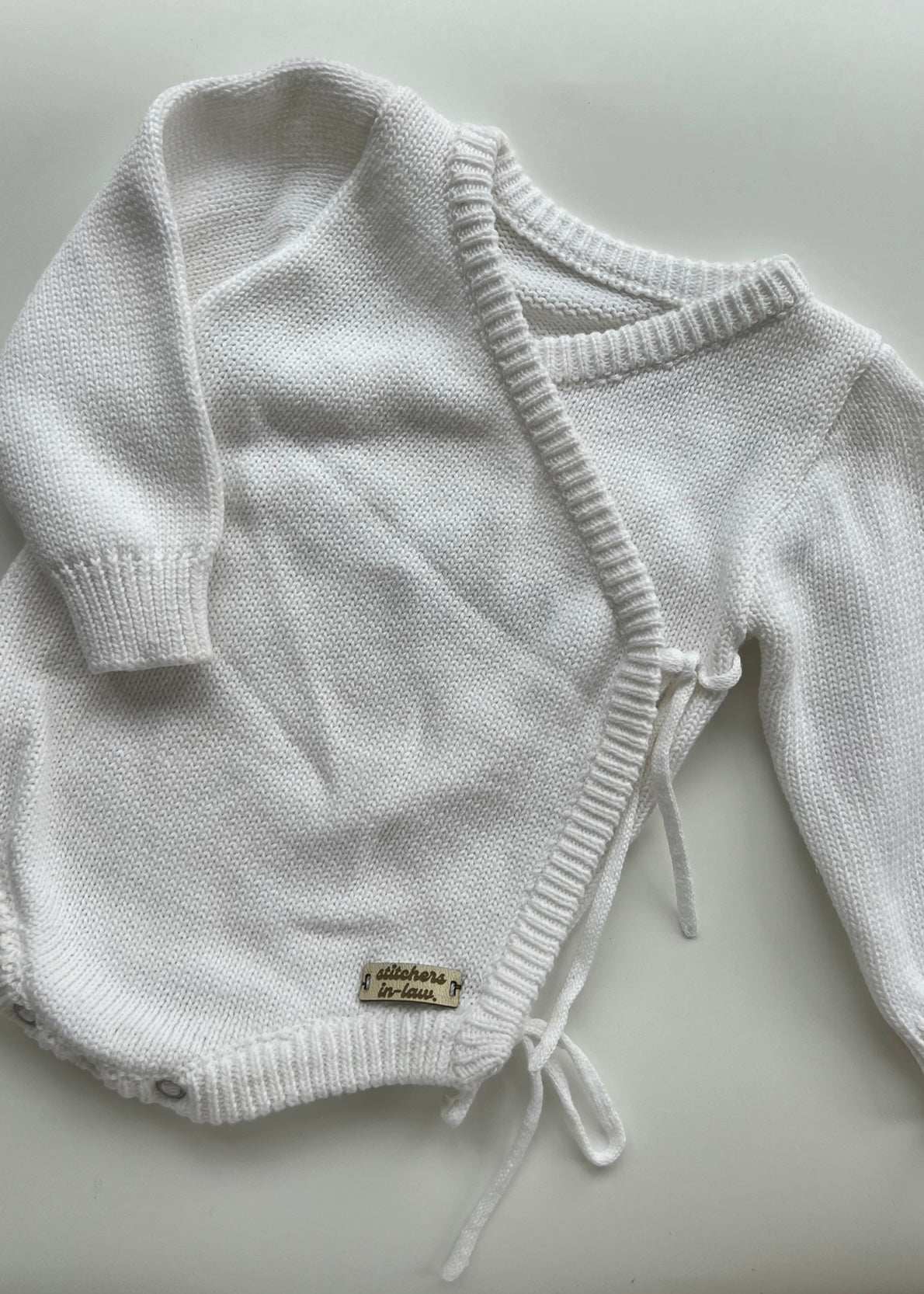 A soft, hand-knitted baby romper designed for comfort and style. Crafted from high-quality yarn, it features a wrap-around design with tie closures, making it easy to dress your little one. Its timeless design makes it a perfect gift for baby showers, christenings, or welcoming a new baby into the world.